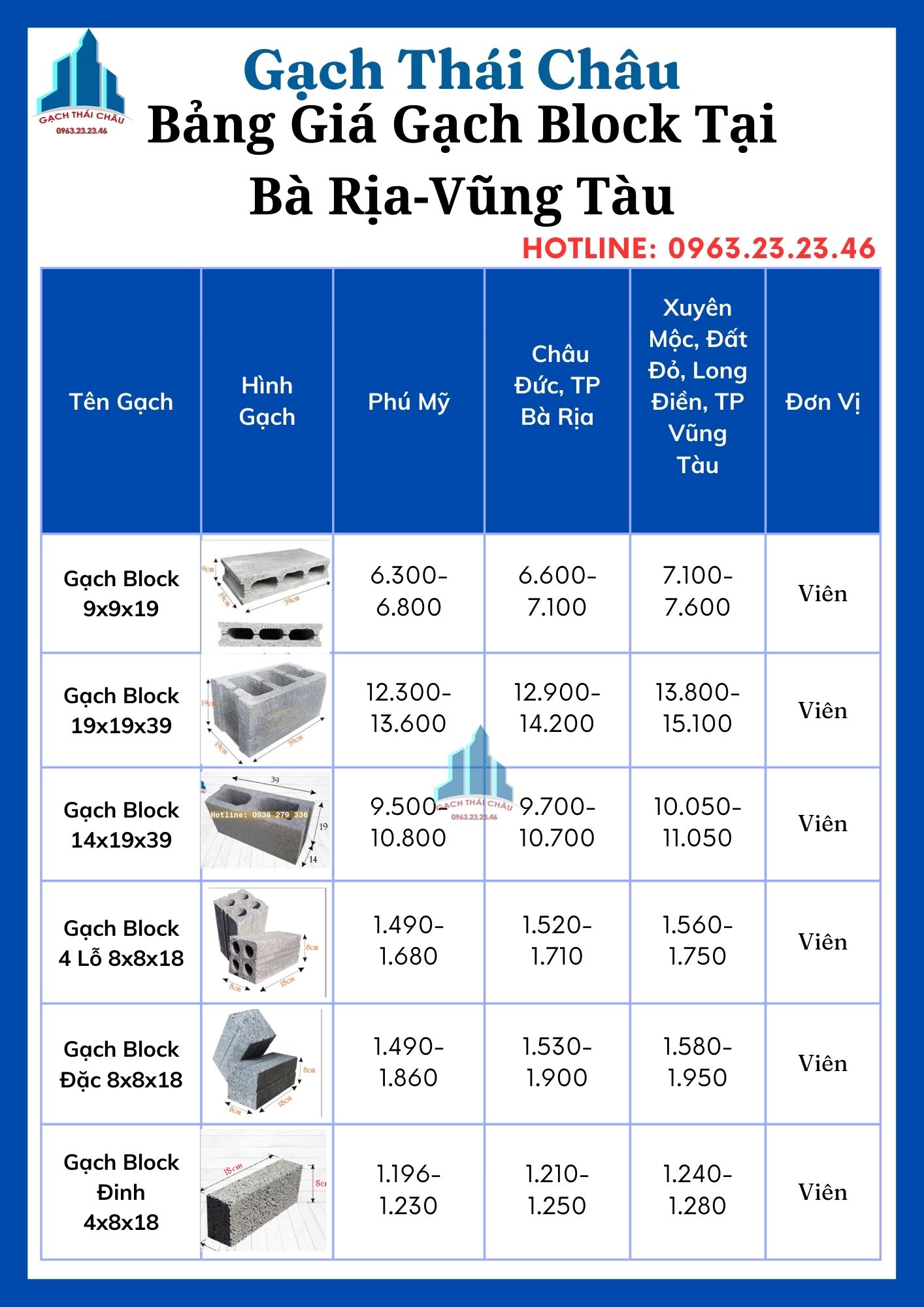 => Giá gạch block tại Bà Rịa-Vũng Tàu cụ thể như sau: giá gạch block 9x9x19 tại chỉ khoảng 6.300-7.600/viên, giá gạch block 14x19x39 là 9.500-11.050/viên, giá gạch block 19x19x39 chỉ nằm trong tầm 12.300-15.100/viên, giá gạch block 4 lỗ 8x8x18 là 1.490-1.750/viên, giá gạch block đặc 8x8x18 trong tầm 1.490-1.950/viên và giá gạch block đinh 4x8x18 là 1.196-1.280/viên. Để biết rõ thông tin về giá gạch block tại các huyện của Bà Rịa-Vũng Tàu, mời quý khách hàng tham khảo bảng giá dưới đây: