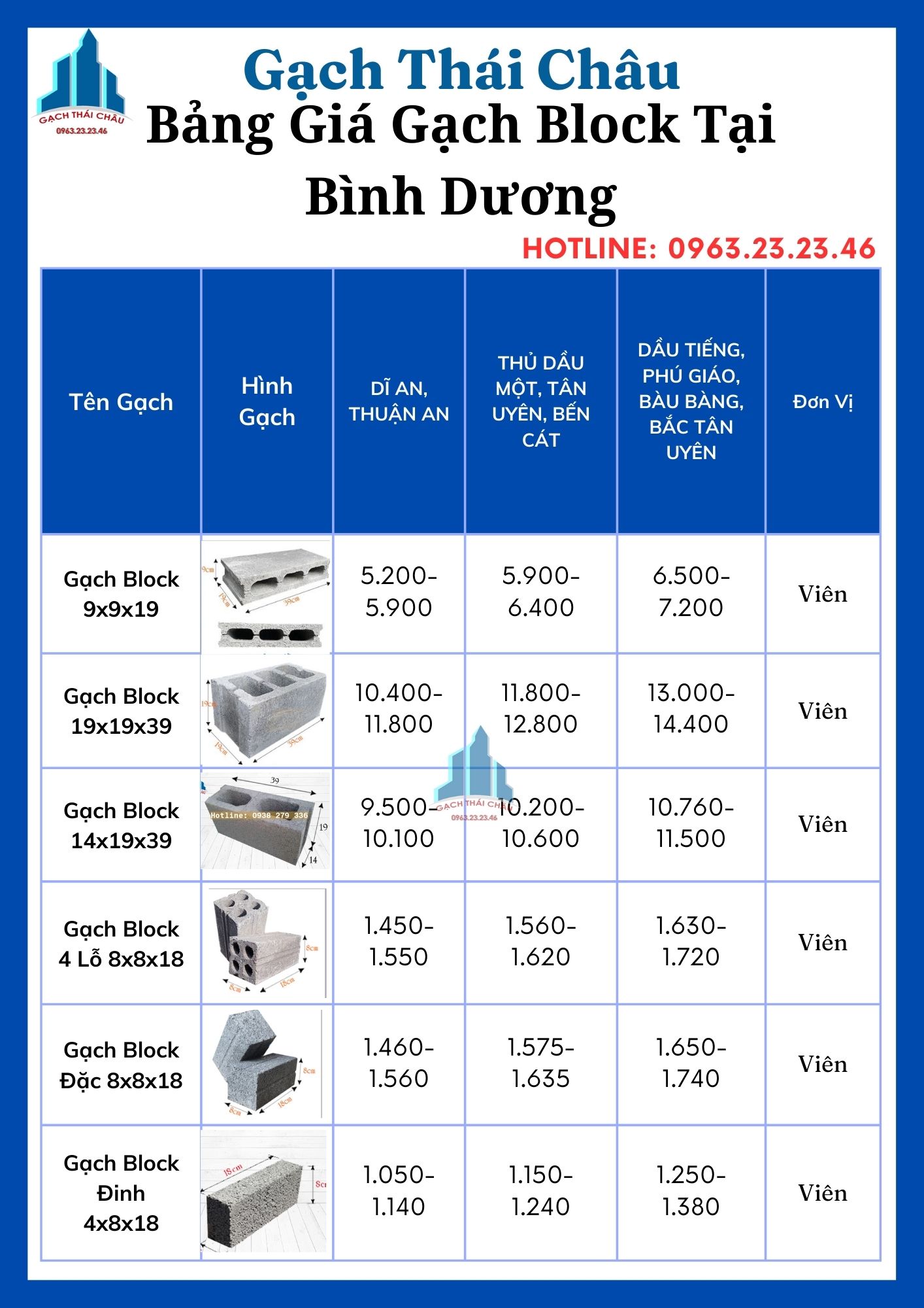 BẢNG GIÁ GẠCH BLOCK TẠI BÌNH DƯƠNG