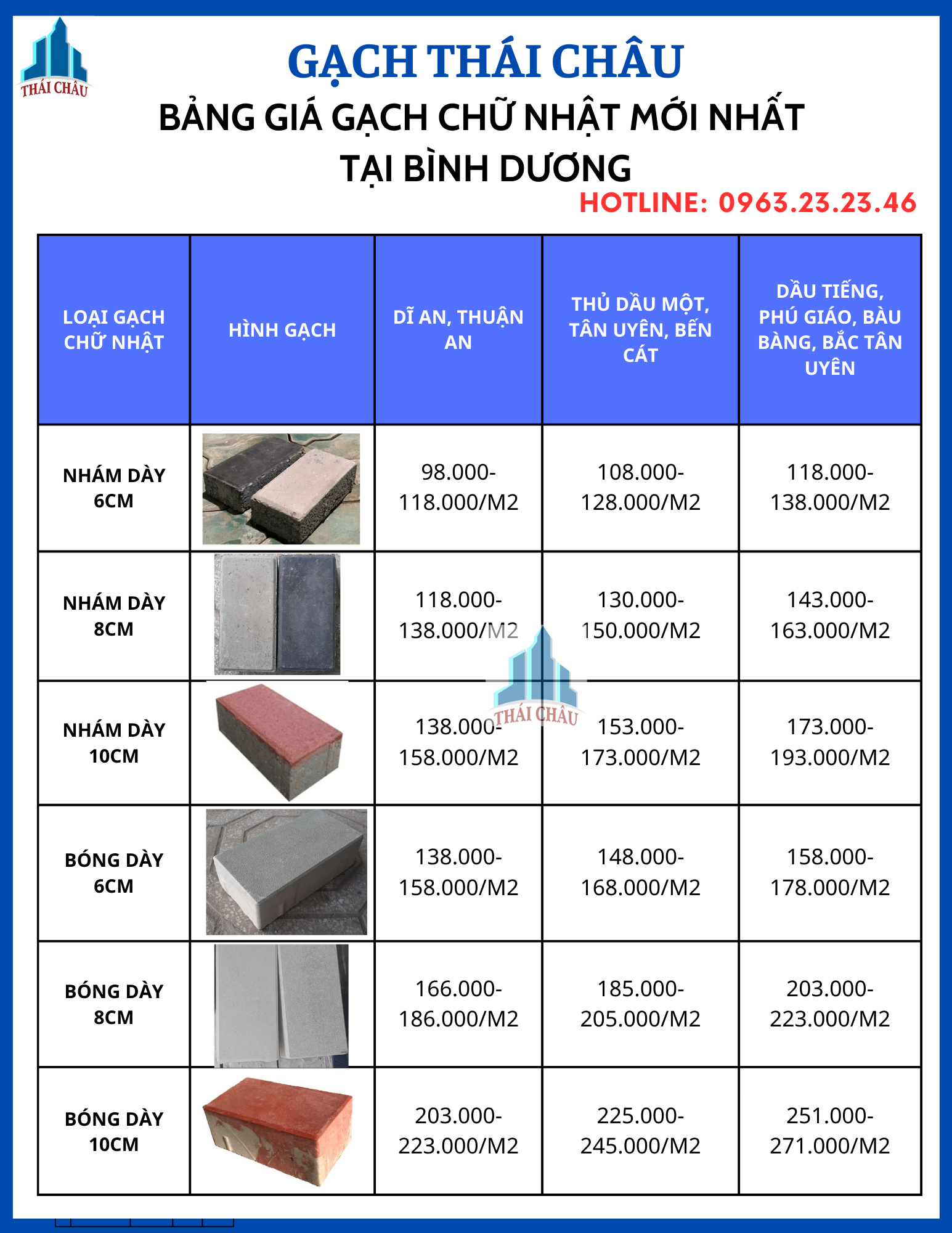 Tại Tỉnh Bình Dương, giá gạch chữ nhật sẽ nằm trong khoảng 98-271.000/m2. Gạch chữ nhật giao tới Bình Dương sẽ tốt nhất nếu công trình nằm tại Thành phố Dĩ An, Thuận An do khoảng cách gần với nhà máy, nhu cầu sử dụng gạch bê tông tự chèn cao cho các dự án khu công nghiệp. Giá gạch chữ nhật dày 6cm khi giao tới Dĩ An, Thuận An rơi vào khoảng 98-223.000/m2. Cụ thể hơn, gạch chữ nhật dày 6cm giao tới công trình tại Thuận An có giá thành là 98-118.000/m2. Với các huyện tại trung tâm như Thủ Dầu Một, Tân Uyên, Bến Cát thì giá gạch chữ nhật sẽ nhỉnh hơn một chút, chỉ khoảng từ 108.000 đến 245.000/m2. Xem chi tiết bảng giá gạch chữ nhật giao tới các huyện tại Bình Dương dưới đây: