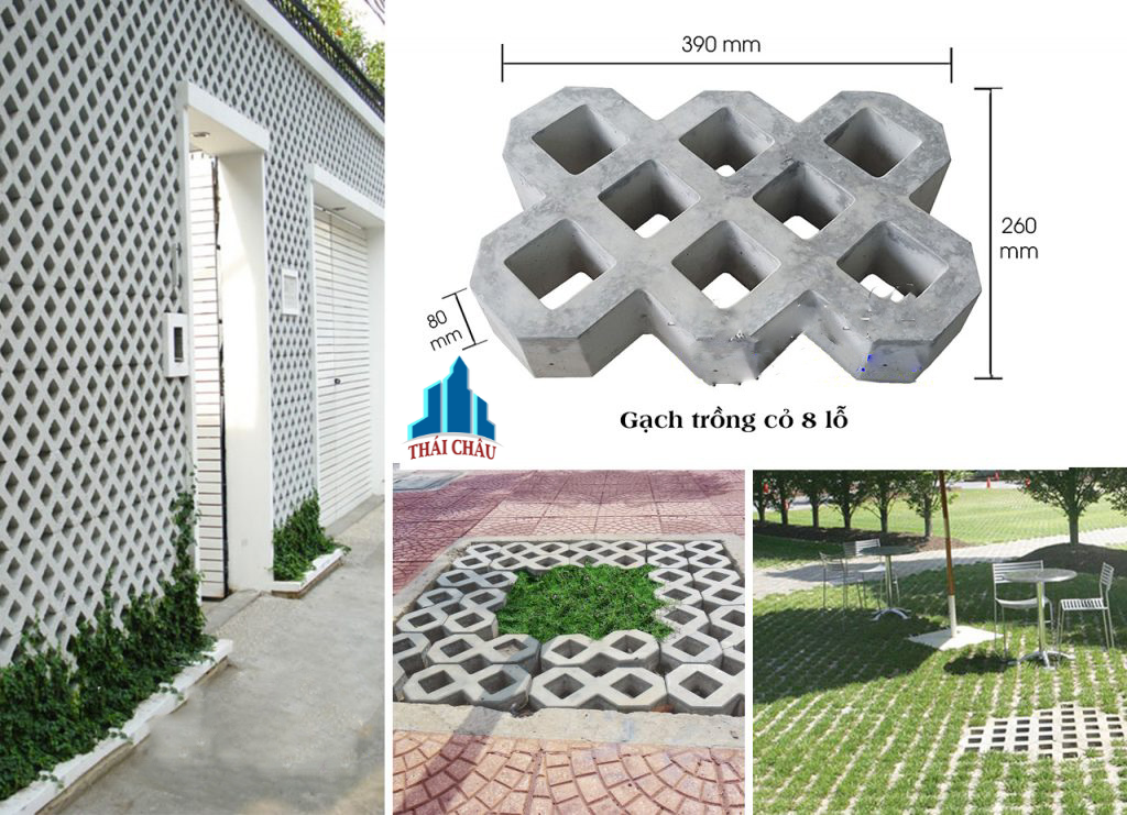 + Gạch 8 lỗ trồng cỏ: 390x260x80 (±2) mm.