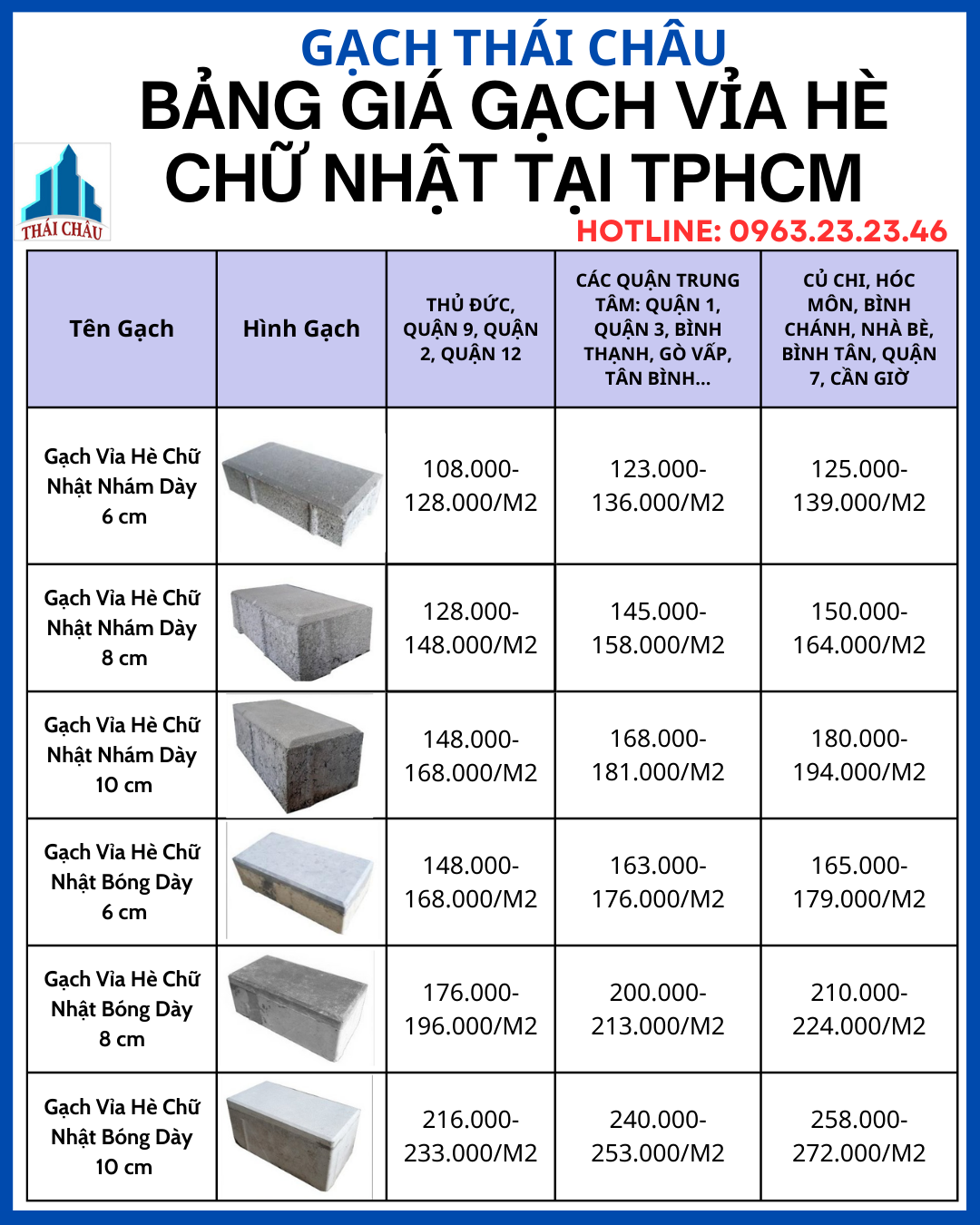 Để biết giá chi tiết của giá gạch vỉa hè chữ nhật giao tới công trình hãy liên hệ ngay với Thái Châu để nhận được báo giá gạch vỉa hè chữ nhật tốt nhất cho công trình của bạn. Gạch Thái Châu đã và đang là đơn vị cung cấp gạch có uy tín hàng đầu tại khu vực Miền Nam. Công ty chuyên cung cấp giá đấu thầu, dự toán cho các dự án lớn, trọng điểm. Vì có nhà máy sản xuất nên giá thành sản phẩm luôn thấp nhất, sát giá nhất cho khách hàng sử dụng. Nếu có thắc mắc về giá gạch vỉa hè chữ nhật, chất lượng sản phẩm, tiến độ đặt hàng và giao hàng. Xin quý khách liên hệ với NV tư vấn Hotline: 0963 2323 46 hoặc quý khách để lại thông tin Email, số điện thoại của mình qua cửa sổ chát offline ở cuối màn hình của trang Web. Nhân viên tư vấn bán hàng của Gạch Block Thái Châu sẽ liên lạc lại và tư vấn mọi yêu cầu.
