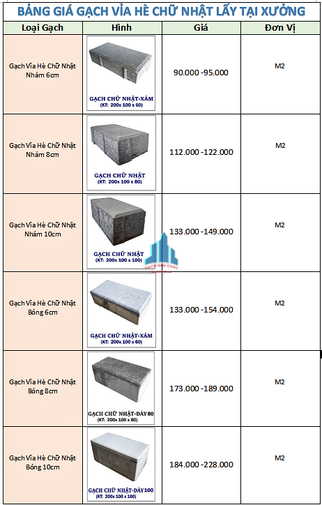 - Giá gạch vỉa hè chữ nhật loại nhám dao động trong khoảng từ 90.000- 228.000/m2 đối với Mac 200, đây là giá áp dụng cho lấy tại xưởng, nhà máy. Đối với Mac từ 250-400, giá gạch vỉa hè chữ nhật sẽ cộng thêm từ 40.000-80.000/m2. Gạch vỉa hè chữ nhật loại nhám được sản xuất bằng công nghệ ép thuỷ lực hiện đại nên quá trình sản xuất gạch nhanh chóng, đảm bảo đáp ứng được yêu cầu của thị trường. Ngoài ra, các công trình sử dụng gạch vỉa hè chữ nhật loại nhám sẽ được đảm bảo về độ an toàn nhờ bề mặt nhám, độ bám tốt, chống trơn trượt cao.