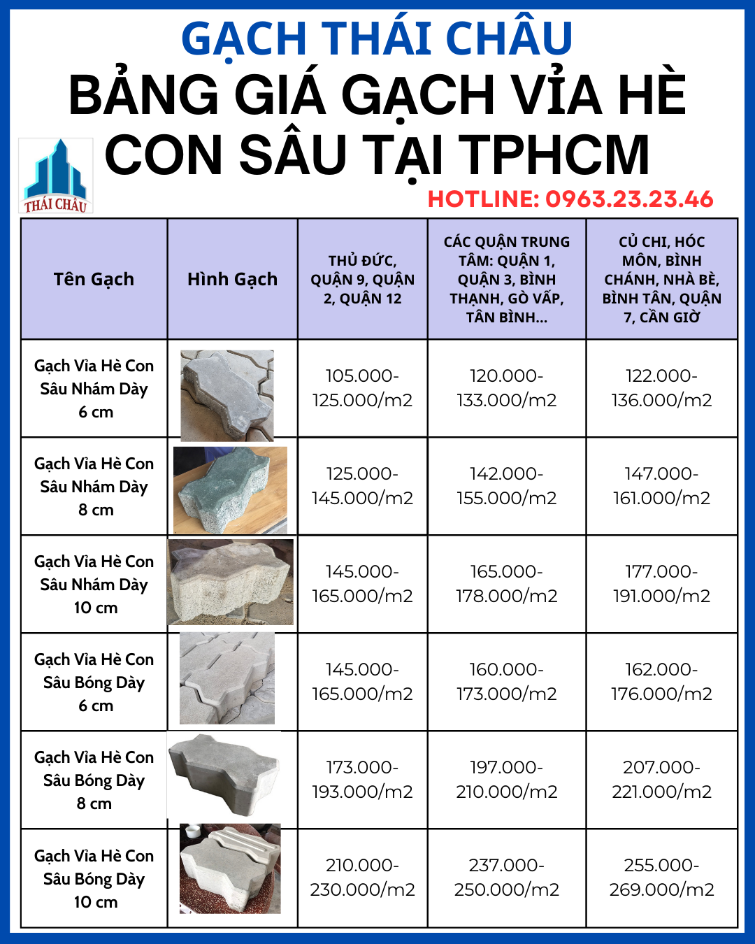 => Trên đây là giá gạch vỉa hè con sâu cơ bản tại nhà máy Gạch Thái Châu. Tuy nhiên để giao hàng tới tận các công trình ở Tp Hồ Chí Minh thì thường phải cộng thêm chi phí vận tải khoảng biên độ từ 10 đến 30% tuỳ theo số lượng và vị trí giao hàng. Giá vận chuyển gạch vỉa hè con sâu tương đối tốt do kích thước của gạch nhỏ, dễ dàng đóng kiện. Sau đây là bảng giá chi tiết của gạch vỉa hè con sâu khi giao đến tận các công trình tại TP Hồ Chí Minh.