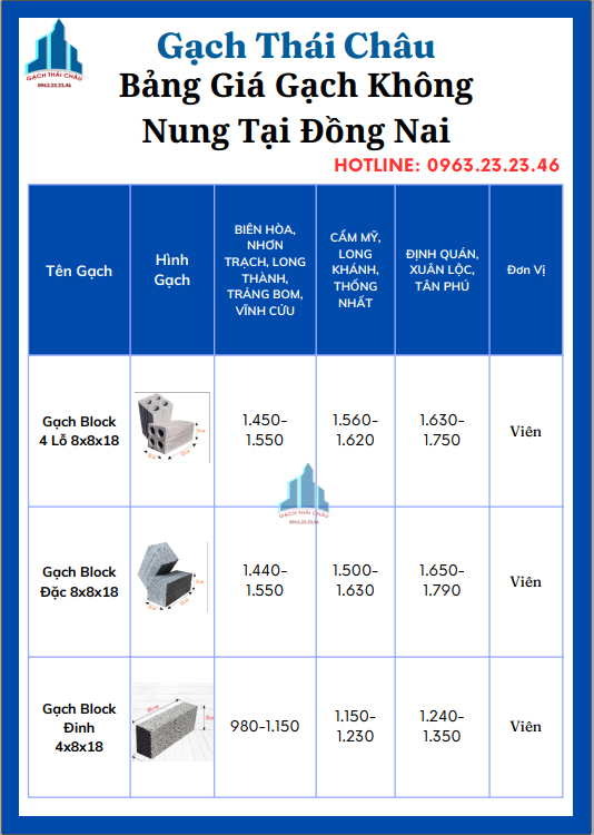 Lưu ý: báo giá trên chỉ mang tính chất tham khảo khi lấy gạch tại nhà máy sản xuất. Thực tế, giá gạch không nung 4 lỗ còn phụ thuộc vào mac gạch, số lượng và vị trí công trình. Để nắm được rõ hơn giá gạch không nung 4 lỗ giao tới tận công trình của mình ở khu vực phía Nam, xin quý khách hàng vui lòng liên hệ tại góc cuối của màn hình trang web hoặc gọi số điện thoại: 0963.23.23.46 nhân viên tư vấn của Gạch Thái Châu sẽ tư vấn thật kỹ về các loại gạch và tính toán chi tiết giá gạch không nung 4 lỗ giao về công trình của bạn.