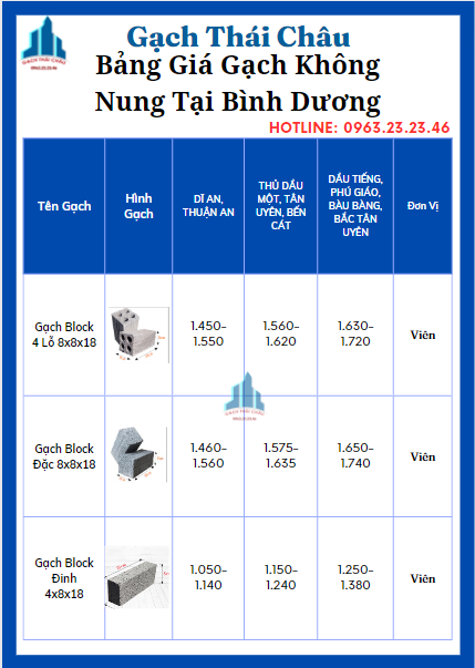 Sở hữu hàng loạt các khu công nghiệp lớn như Khu công nghiệp Việt Nam – Singapore, Khu công nghiệp Bình Đường, Khu công nghiệp Đồng An, Khu công nghiệp Mỹ Phước, Khu công nghiệp Sóng Thần,…đã giúp cho Bình Dương trở thành một trong những tỉnh có nhu cầu sử dụng gạch không nung nhiều nhất tại khu vực Phía Nam. Nắm bắt được điều kiện thuận lợi này, Gạch Thái Châu đã và đang là nhà cung cấp gạch không nung hàng đầu cho các dự án, công trình lớn tại Bình Dương. Giá gạch không nung 4 lỗ tại Bình Dương tương đối tốt, đặc biệt giá gạch vô cùng cạnh tranh dành cho các công trình lớn, giá gạch không nung 4 lỗ chỉ từ 1.550-1.720/viên.