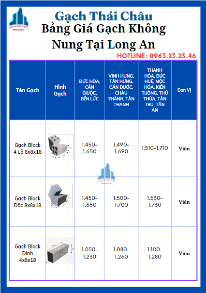 Long An là tỉnh đang có rất nhiều dự án của các khu công nghiệp lớn như Khu công nghiệp Cầu cảng Phước Đông, Khu công nghiệp Cầu Tràm, Khu công nghiệp Tân Kim, Khu công nghiệp Long Hậu, Khu công nghiệp Đức Hoà,…Nhờ vậy nên nhu cầu sử dụng gạch không nung 4 lỗ của tỉnh Long An vô cùng lớn khiến cho thị trường giá gạch ở nơi đây vô cùng cạnh tranh và sôi động. Giá gạch không nung 4 lỗ ở Long An nhìn chung nằm trong khoảng từ 1.450-1.710/viên.