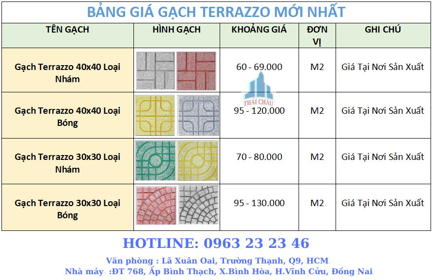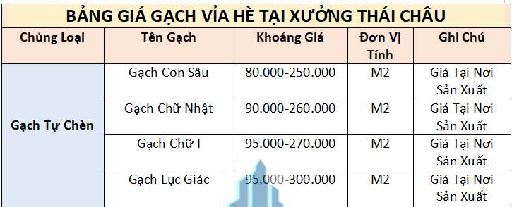 Gạch Thái Châu xin giải đáp thắc mắc của khách hàng là gạch lát vỉa hè giá bao nhiêu dựa theo loại gạch. Như đã giới thiệu ở phần trước thì gạch lát vỉa hè có 3 loại chính là gạch lát vỉa hè terrazzo, gạch lát vỉa hè trồng cỏ và gạch lát vỉa hè tự chèn. Sau đây là bảng giá gạch lát vỉa hè được cập nhật bởi Công ty Sản Xuất Gạch Thái Châu: