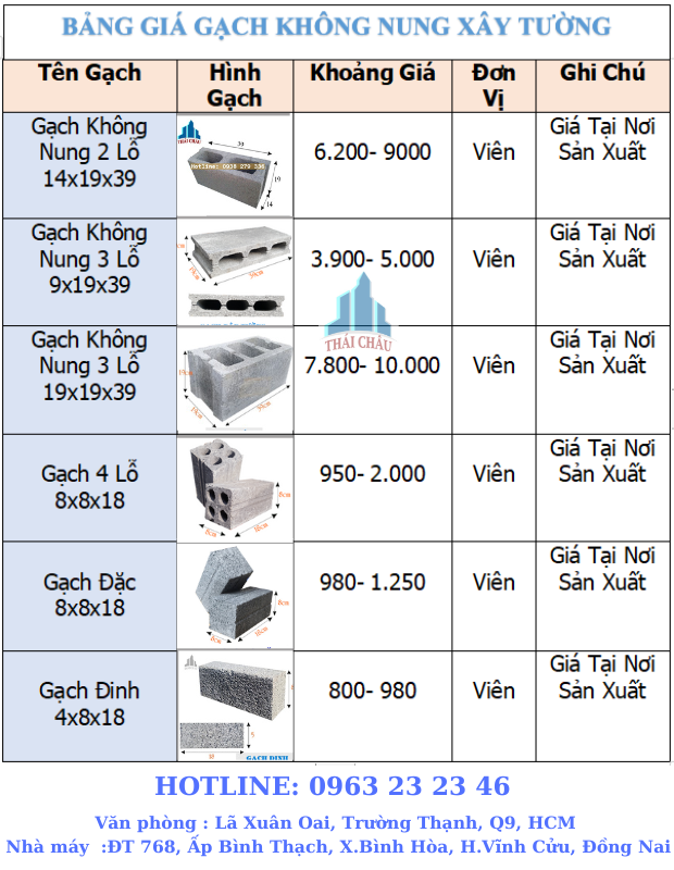 Dưới đây là bảng giá gạch không nung xây tường tại xưởng mới nhất được cập nhật từ công ty Gạch Thái Châu: