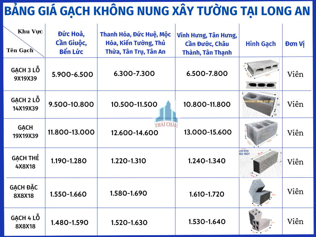 => Trên đây là giá gạch không nung xây tường cơ bản tại nhà máy Gạch Thái Châu. Tuy nhiên để giao hàng tới tận các công trình ở khu vực Long An thì thường phải cộng thêm chi phí vận tải khoảng biên độ từ 20 đến 40% tuỳ theo loại gạch, số lượng và vị trí giao hàng. Giá vận chuyển gạch không nung xây tường thường có giá tốt hơn nhờ viên gạch có thành phần cốt liệu giống bê tông vì vậy trọng lượng riêng của gạch tương đối nhẹ như bê tông. Những kích thước của dòng gạch không nung có độ rỗng như 9x19x39, 19x19x39,…có chi phí vận chuyển tốt hơn so với các kích thước gạch nhỏ và đặc như gạch đặc 8x8x18, gạch thẻ 4x8x18,…