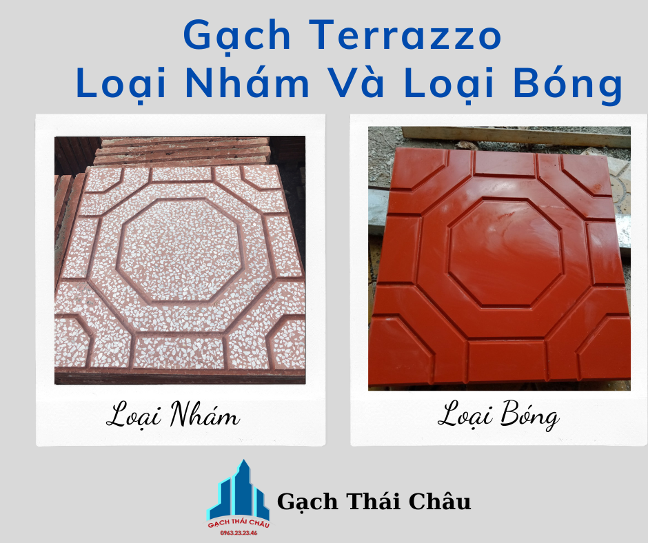 + Loại gạch: gạch terrazzo hiện nay được chia thành 2 loại chính là loại bóng và loại nhám. Nếu xét về yếu tố giá thành thì loại bóng có giá thành nhỉnh hơn loại nhám, chênh lệch từ 30-40%. Lý do là vì loại bóng được sản xuất bằng công nghệ đổ khuôn nhựa, thời gian sản xuất lâu hơn, sử dụng nguyên liệu xi măng trắng và bột màu cao cấp, gạch terrazzo khi sản xuất hoàn thiện sở hữu bề mặt bóng nhẵn, rất đẹp. Còn loại nhám thì sản xuất bằng công nghệ ép thuỷ lực, thời gian sản xuất nhanh chóng, một lần ép được số lượng nhiều, quá trình sản xuất có trải qua công đoạn mài nhám nên có bề mặt lộ đá nhám sần, thích hợp với những công trình yêu cầu cao về tính an toàn như vỉa hè đi bộ, sân chơi,…