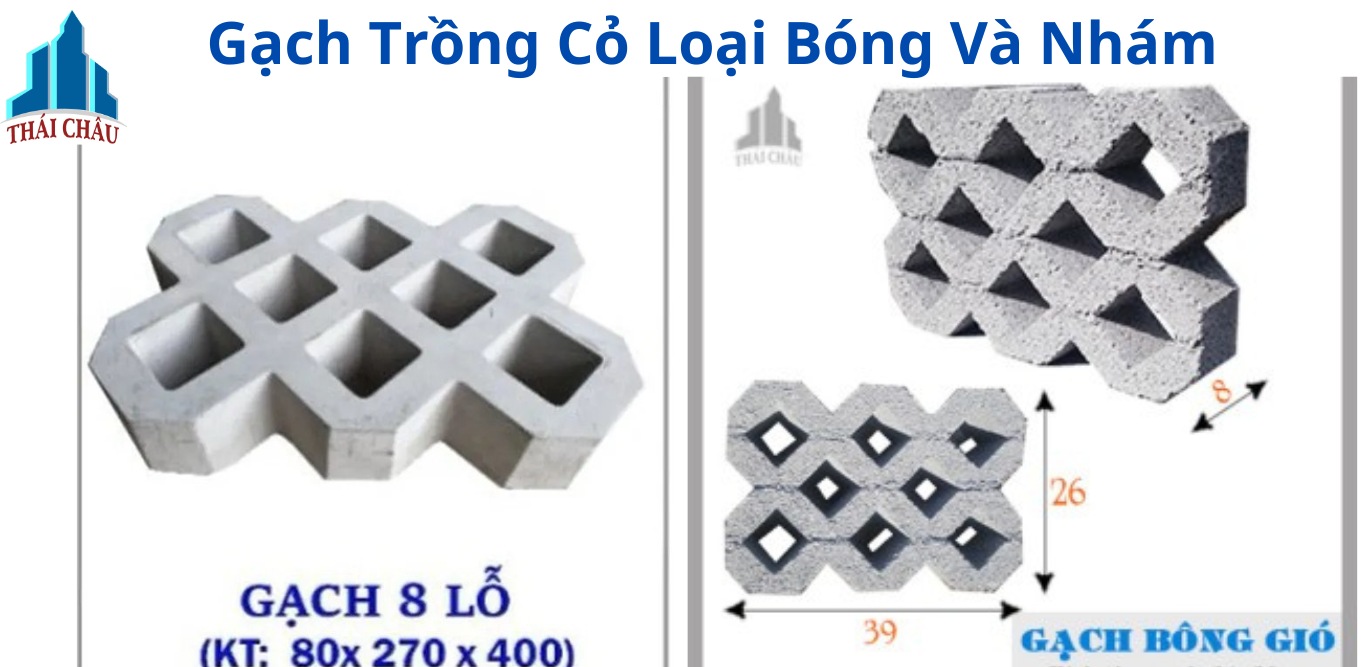 + Loại gạch: gạch trồng cỏ được sản xuất thành 2 loại là gạch trồng cỏ loại nhám và gạch trồng cỏ loại bóng. Loại nhám có giá gạch tốt hơn so với loại bóng vì có nguyên liệu sản xuất rẻ hơn và thời gian sản xuất nhanh hơn, tự động hoá hoàn toàn quá trình sản xuất. Gạch trồng cỏ loại nhám có sự ma sát cao cũng như có các lỗ trống ở giữa, làm tăng quá trình thoát nước xuống lớp nền ở dưới khi gặp trời mưa. Chính vì đặc tính này mà gạch cực kỳ được ưa chuộng sử dụng tại các vị trí như bờ kè, bãi đỗ xe,… Gạch trồng cỏ loại bóng có bề mặt rất mịn với cường độ chịu lực cao cho nên rất phù hợp cho các công trình vừa cần độ chịu lực vừa cần tính thẩm mỹ như sân vườn, các khu công nghiệp lớn, các bãi đỗ xe của trung tâm thương mại. Loại gạch này đem đến vẻ đẹp tươi mát hơn nhờ các lỗ để cỏ mọc làm tăng không gian xanh cho các công trình. Quá trình sản xuất gạch trồng cỏ loại bóng cần sử dụng đến 70% sức người, nguyên liệu sản xuất đòi hỏi phải sử dụng xi măng trắng nên có giá thành nhỉnh hơn so với loại nhám.