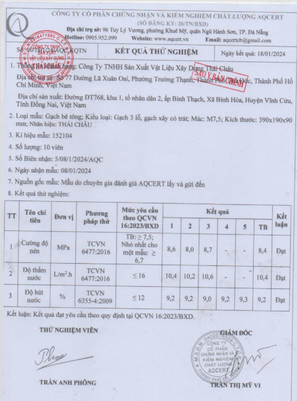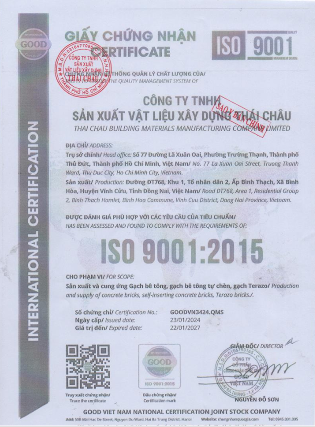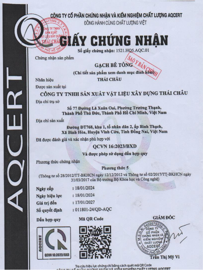 Giấy chứng nhận hợp quy và giấy chứng nhận chất lượng của Nhà máy Sản xuất Gạch Thái Châu