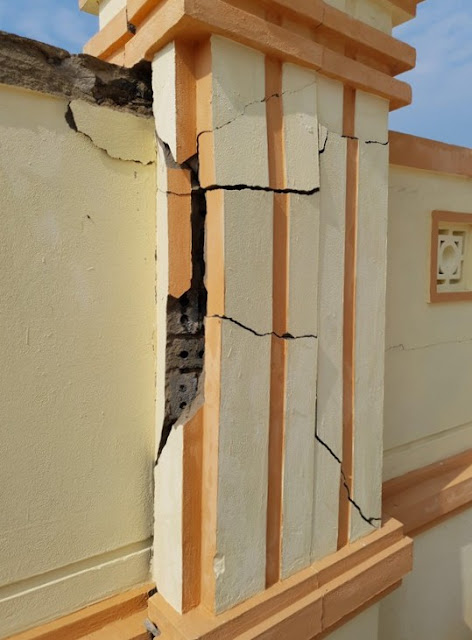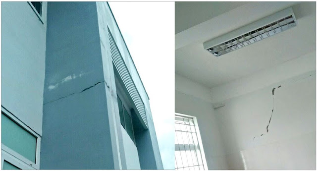 Các bức tường bên trong và bên ngoài nhà xuất hiện hàng chục vết nứt dài 1 - 2m, có vết dài 3 - 4m. Những vết nứt chằng chịt khắp tường khiến cho nhìn vào có cảm giác như công trình đã cũ, hư hỏng, sập sệ.