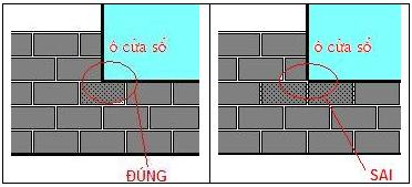 - Kỹ thuật xây: Thợ xây đặt vị trí viên gạch tại vị trí góc dưới cửa sổ chưa đúng kỹ thuật như hình dưới cũng là 1 nguyên nhân (mạch vữa trùng cạnh cửa):