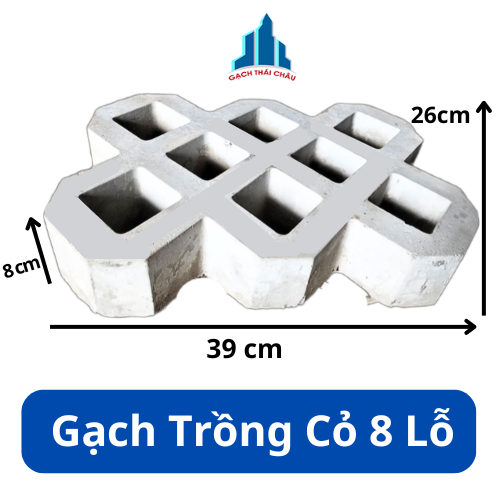 Gạch trồng cỏ 8 lỗ có kích thước chuẩn cụ thể như sau: Dài 39cm, cao 26cm, dày 8cm, trọng lượng khi khô: 9kg/viên. Giống như tên gọi của mình, trên bề mặt của gạch có 8 lỗ rỗng có tác dụng thoát nước nhanh và để trồng cỏ, tạo nên không gian xanh cho khu vực được lát. Định mức của gạch trồng cỏ 8 lỗ là 10 viên trên 1m2. Tiêu chuẩn của gạch: ISO 9001:2008, TCVN 6476:2011. Gạch trồng cỏ 8 lỗ có cường độ chịu lực: ≥5 Mpa, độ rỗng: 43% và độ bền: ≤ 7%. Gạch trồng cỏ 8 lỗ có thể đạt được Mac từ 75-500.