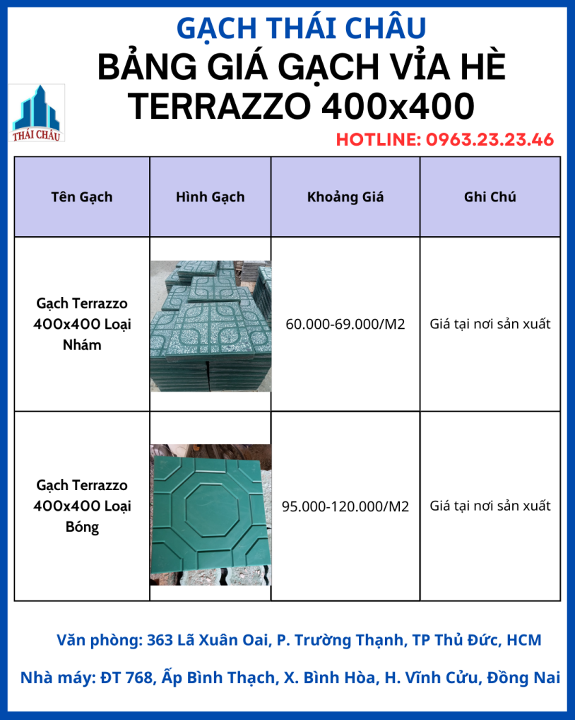 Vì gạch terrazzo 400x400 chỉ có độ dày từ 2-3cm nên nguyên liệu sử dụng để sản xuất cũng tương đối ít, quy trình sản xuất nhanh chóng, đơn giản, giá của gạch terrazzo chỉ nằm trong khoảng từ 70-95.000/m2 tuỳ theo khu vực vận chuyển, chủng loại, kích thước, màu sắc, chất lượng. Thêm vào đó, vì gạch terrazzo 400x400 có kích thước vuông vắn, trọng lượng tương đối nhẹ và độ dày không quá cao nên rất dễ để đóng thành kiện, quá trình giao hàng tương đối nhanh nên có chi phí vận chuyển không quá cao.