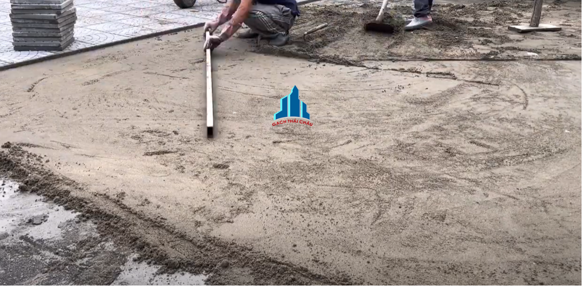 Sau khi chuẩn bị lớp nền thật bằng phẳng và không có vật cản gì, bạn sẽ tiến hành tạo lớp nền bằng cát. Bạn rải một lớp cát mỏng có chiều dày từ 3-5cm, cần sử dụng các dụng cụ thi công cần thiết như là: thước, bàn xoa,… để tiến hành san phẳng nhằm đảm bảo độ chịu lực tốt và tính thẩm mỹ cao. Đối với các công trình có diện tích lớn nên sử dụng máy đầm nền để tiết kiệm thời gian, nhân công, chi phí và có hiệu quả cao hơn. Chú ý, dùng máy đầm hoặc bay cán nền thật kỹ, đảm bảo không bị lún hay lẫn sỏi đá làm ảnh hưởng đến chất lượng nền sau khi hoàn thiện. Căn chỉnh cao độ, độ dốc đi về hướng hố ga hay đường thoát nước.