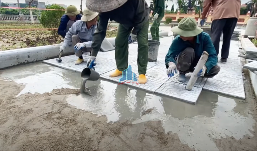 Tiếp theo, trộn xi măng cùng với nước tạo thành một lớp hồ dầu mỏng sau đó tráng lên trên nền cát trước đó. Lưu ý, xi măng sử dụng Mac 50-70 và phải trộn với nước theo tỉ lệ 1:4. Lớp hồ dầu này sẽ tạo sự kết dính giữa nền và gạch terrazzo 400x400 khi lát. Tuy nhiên, để tạo được hiệu quả tốt nhất, bạn nên tưới hồ dầu đến đâu thì đặt gạch đến đó. Việc này sẽ giúp hồ dầu ở trạng thái tốt nhất, tránh bị khô quá ảnh hưởng đến chất lượng công trình.