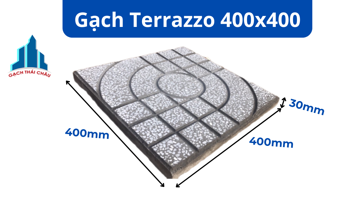 Gạch terrazzo 400x400 có kích thước chuẩn là dài 400mm, rộng 400mm và dày 3cm. Với kích thước 400x400 thì định mức của gạch là 6,25 viên/m2. Gạch terrazzo 400x400 có trọng lượng nặng 12kg, tính ra trung bình một m2 lát vỉa hè terrazzo chỉ nặng 75kg.