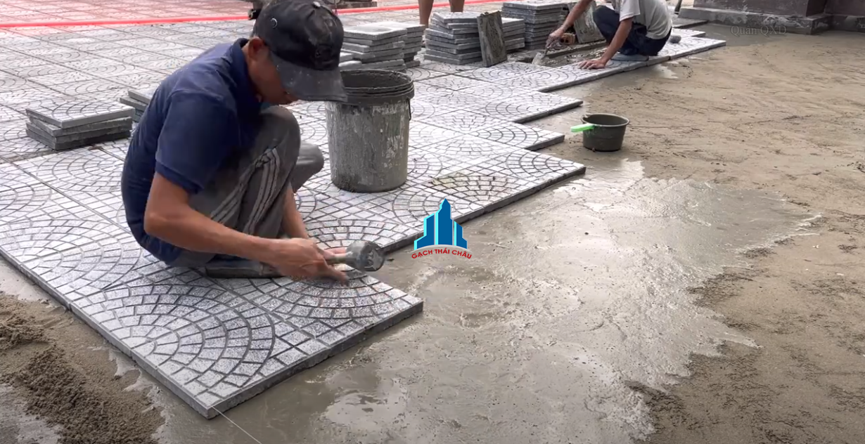Tiếp theo, trộn xi măng cùng với nước tạo thành một lớp hồ dầu mỏng sau đó tráng lên trên nền cát trước đó. Lưu ý, xi măng sử dụng Mac 50-70 và phải trộn với nước theo tỉ lệ 1:4. Lớp hồ dầu này sẽ tạo sự kết dính giữa nền và gạch terrazzo khi lát. Tuy nhiên, để tạo được hiệu quả tốt nhất, bạn nên tưới hồ dầu đến đâu thì đặt gạch đến đó. Việc này sẽ giúp hồ dầu ở trạng thái tốt nhất, tránh bị khô quá ảnh hưởng đến chất lượng công trình.