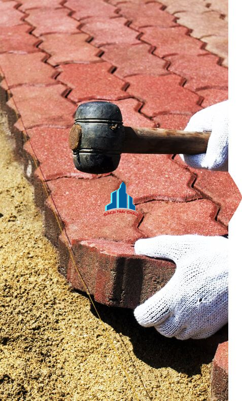 Sau khi chuẩn bị kĩ nền, bắt đầu tiến hành lát gạch con sâu. Một mẹo nhỏ giúp cho việc lấy cữ mép ngoài cùng dễ hơn là sử dụng gạch con sâu để lấy cữ luôn, vừa nhanh vừa hiệu quả trong việc tạo ra đường thẳng. Bắt đầu lát gạch từ góc, nhớ dùng bay làm phẳng nền cát trước khi đặt gạch. Chú ý góc căng dây phải kiểm tra thật vuông. Tiếp theo đặt viên gạch đầu tiên thật chuẩn tại góc, đặt các viên tiếp theo thật sát và khít. Vì gạch con sâu là loại gạch tự chèn nên không cần sử dụng thêm chất kết dính nào, các viên gạch khi lát trên nền cát sẽ tự khóa vào nhau vô cùng chắc chắn. Nhờ đặc tính này mà việc bảo trì, sửa chữa gạch sẽ rất đơn giản, bạn chỉ cần nhấc viên gạch tại vị trí cục bộ cần thay thế sau đó đặt viên gạch mới mà không ảnh hưởng đến toàn bộ công trình. Sau đó, cứ thế tiếp tục đặt các viên gạch con sâu liên tục theo hình dáng lát bạn chọn, các mẫu lát phổ biến là xương cá, so le,.. Tham khảo thêm các kiểu lát gạch con sâu phổ biến tại: 3 Kiểu Mẫu Lát Gạch Con Sâu Siêu Đẹp. Thêm một lưu ý quan trọng là phải đặt gạch đến đâu thì dùng búa cao su gõ đến đó, việc này giúp tạo độ khít giữa các viên gạch với nhau và với nền cát, ngoài ra nó còn để tránh viên gạch khập khiễng phải dỡ ra lát lại. Cuối cùng, cứ tiếp tục lát gạch con sâu theo đường dây và cữ đã căn trước đó cho đến hết khu vực cần lát.