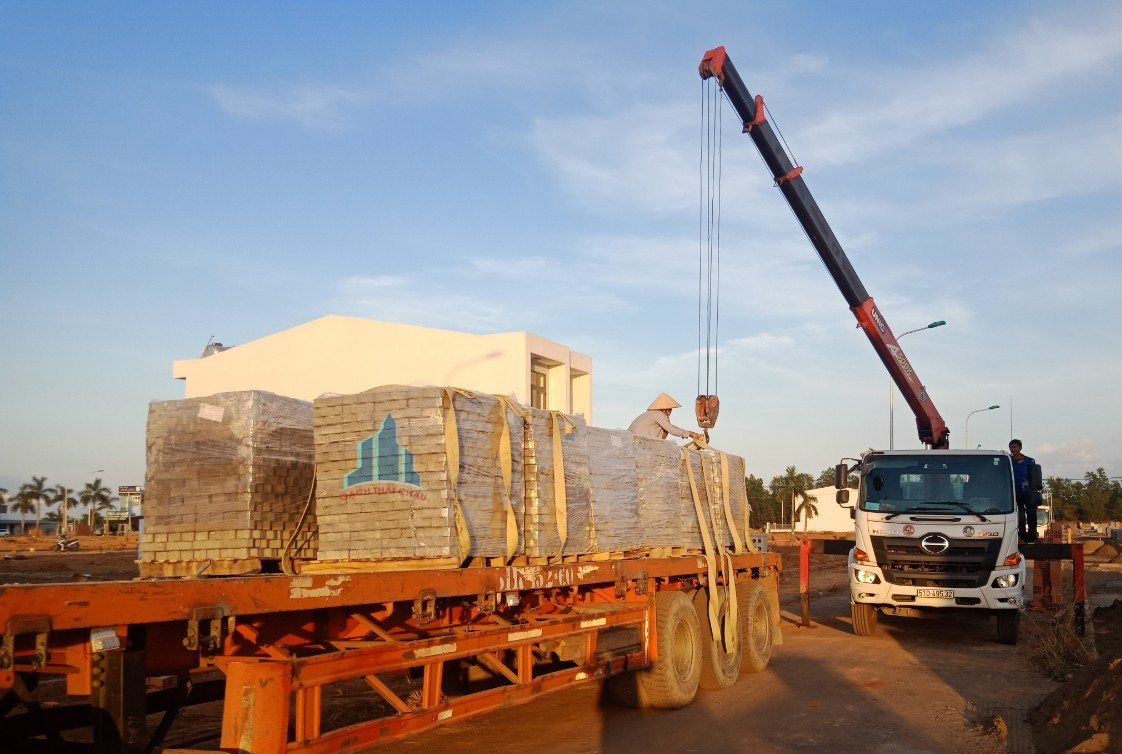Gạch vỉa hè con sâu được vận chuyển bằng xe cẩu chuyên dụng
