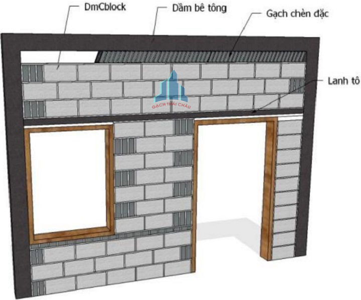 => Cách thi công đúng: Đổ 1 phần phào bê tông/để chờ gạch block quay ngang trước khi tô trát hoàn thiện. Quanh ngang gạch đối với các phào chỉ quanh ô cửa trong khi xây. Sử dụng các loại gạch có độ cứng tốt, Mac gạch cao để đảm bảo được khả năng chịu lực.