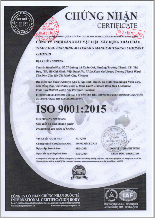 Gạch Không Nung Thái Châu Đạt Chuẩn ISO 9001:2015