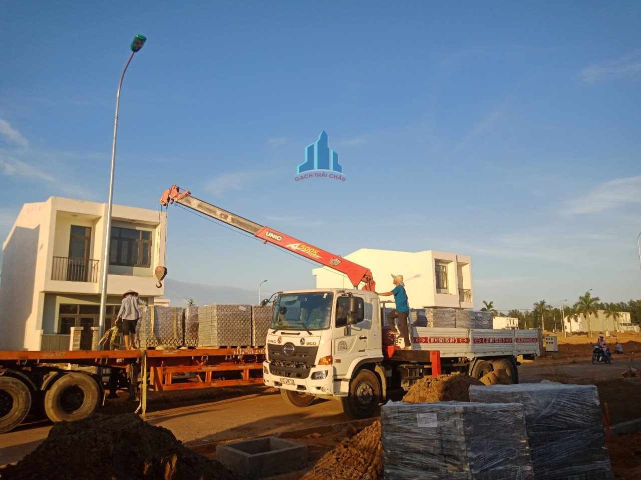 Nhà máy giao gạch tự chèn bằng xe cẩu chuyên dụng