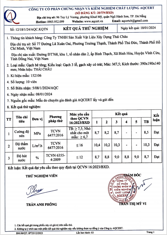 Các chỉ số chất lượng của gạch không nung Thái Châu